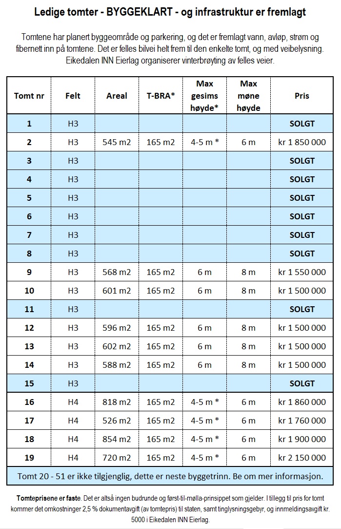 - byggeklare tomter med planert byggeområde og 2 parkeringsplasser